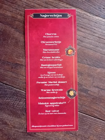 En jawel, toen mochten we ons melden bij ’t Zusje. We zijn er inmiddels zó bekend dat we wel weten welke gerechtjes we fijn vinden. In mijn geval geldt: toetjes, toetjes, en nog eens toetjes. En, inmiddels ook traditie, de avond werd afgesloten met een theetje.