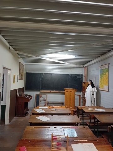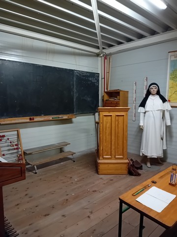 Voor elk kamertje/huisje hangt een touw, dus je kunt niet naar binnen. Maar in het klaslokaal konden we wél naar binnen, dus de juf in mij werd helemaal blij. Helaas lagen er geen krijtjes bij het bord, dus ik kon niet schrijven, maar ik nam wel even plaats achter de lessenaar.