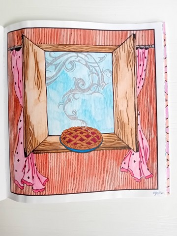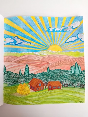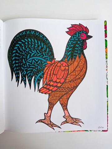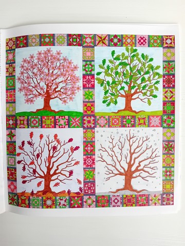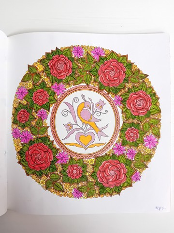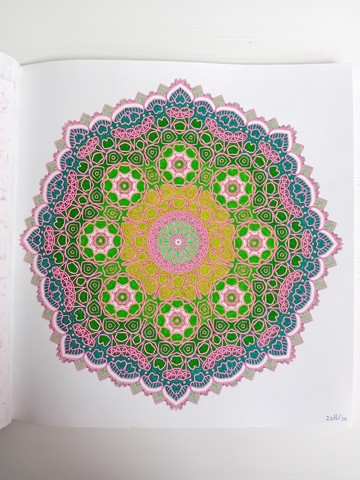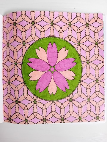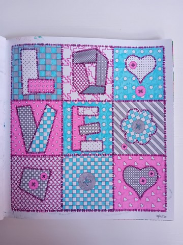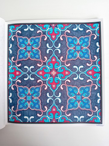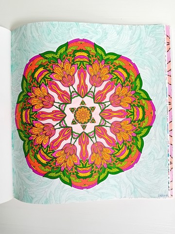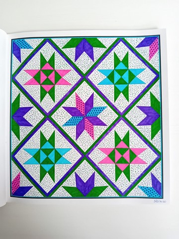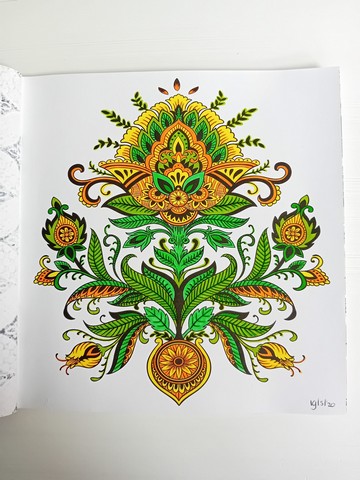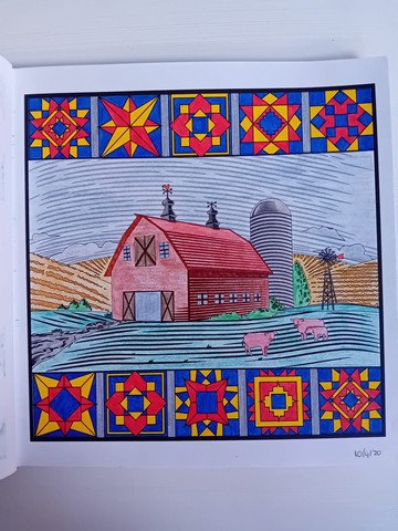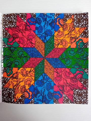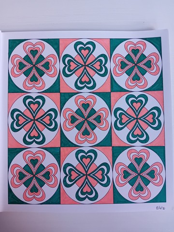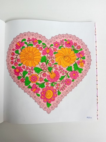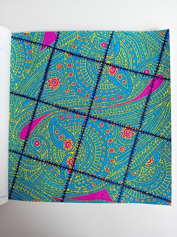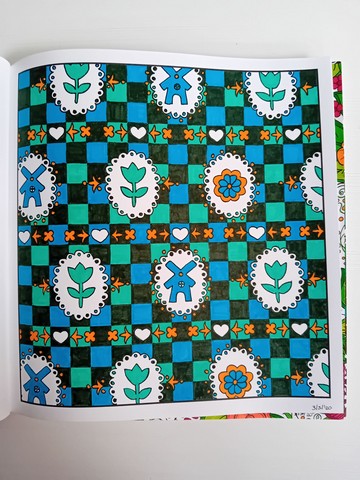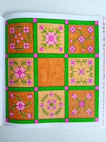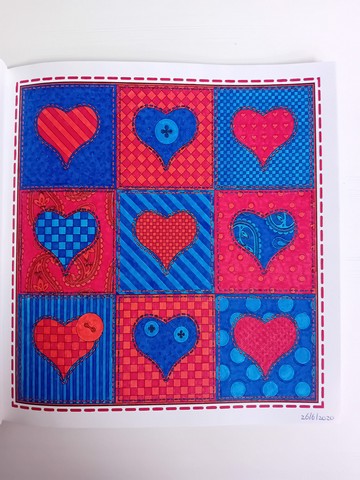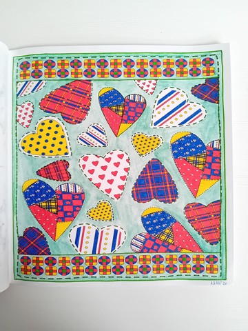 Vandaag kijken we naar ‘Patchwork of the heart’. Ik noem dit mijn lockdownboek. Ik begon erin op 5 april 2020 en kleurde het vol op 6 september 2020. Ik kleurde achter elkaar in dit boek, zonder tussendoor in andere boeken te kleuren. Het is één van mijn favoriete boeken en daarom besloot ik dat dit boek -samen met twee andere boeken- toch ook nog op de kast mag blijven liggen.