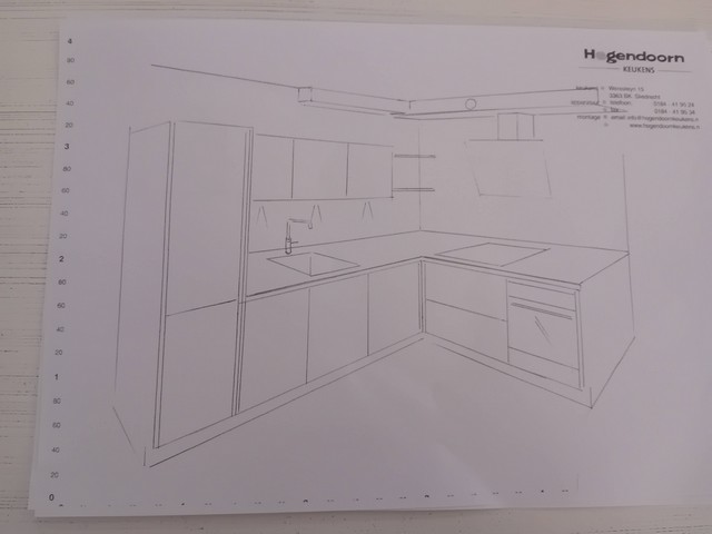 Al bij het zien van de eerste foto’s was het me duidelijk dat de keuken in deze woning vervangen zou moeten worden. Bij de bezichtiging werd dat alleen maar bevestigd. Binnen een week na het ondertekenen van de koopakte zat ik al met een keukenboer om tafel. Eerst had hij bij mijn nieuwe huis de keuken ingemeten en daarna sloeg hij aan het tekenen. Dit moet het worden:
